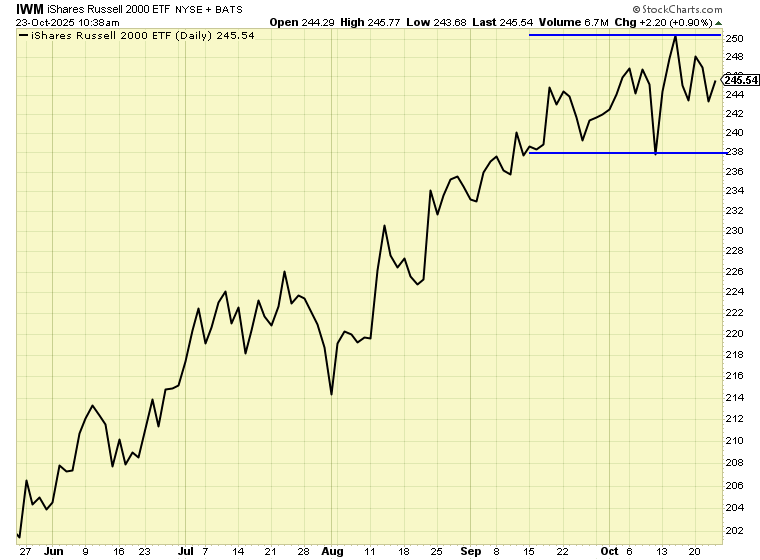 After our October 15 note, the small-cap breakout reversed because of heavy selling pressure. This back-and-forth action has left the small-cap benchmark ETF in a sideways consolidation. As you can see in the chart below, IWM has been stuck in the 238 – 250 area since mid-September.