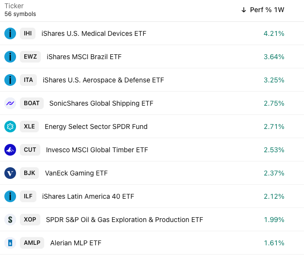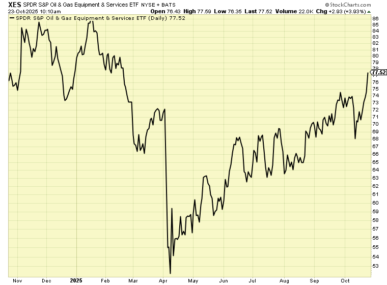 The SPDR Oil & Gas Equipment & Services ETF (XES), which we wrote bullishly on, is up 4% and reached a new six-month high. Oil giants ExxonMobil (XOM), Shell (SHEL), and Chevron (CVX) are moving higher and have strong uptrends working in their favor.
