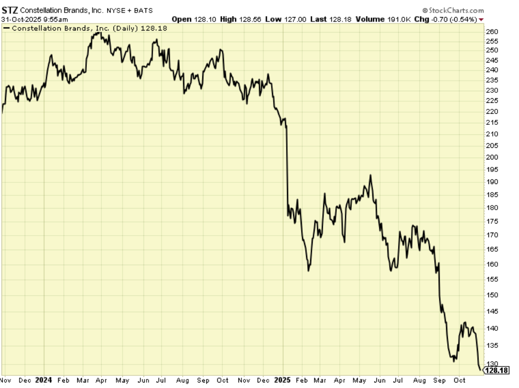 Shares of spirits and beer maker Constellation Brands (STZ) are down 42% over the past two years and hit a multi-year new low this week.