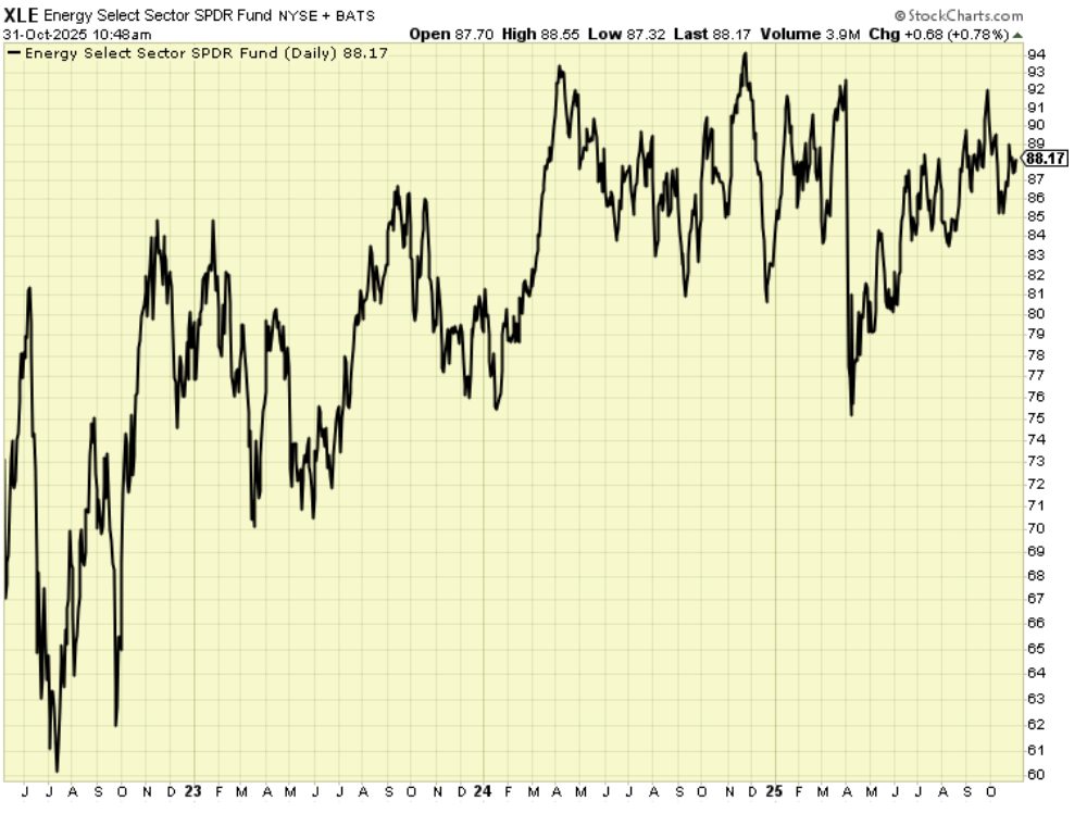 Yet… look at the chart below. It’s a thing of beauty. It shows the price trend of the Energy Select Sector SPDR Fund (XLE) since mid-2022. XLE is one of the world’s largest ETFs. It owns oil and gas giants such as ExxonMobil (XOM), Chevron (CVX), and ConocoPhillips (COP).