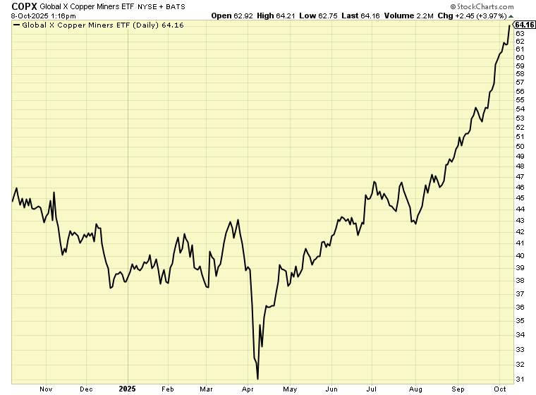 Today, the copper stock group we track (COPX) climbed 3.8% to reach a new all-time high. It’s up 24% in just the past month.